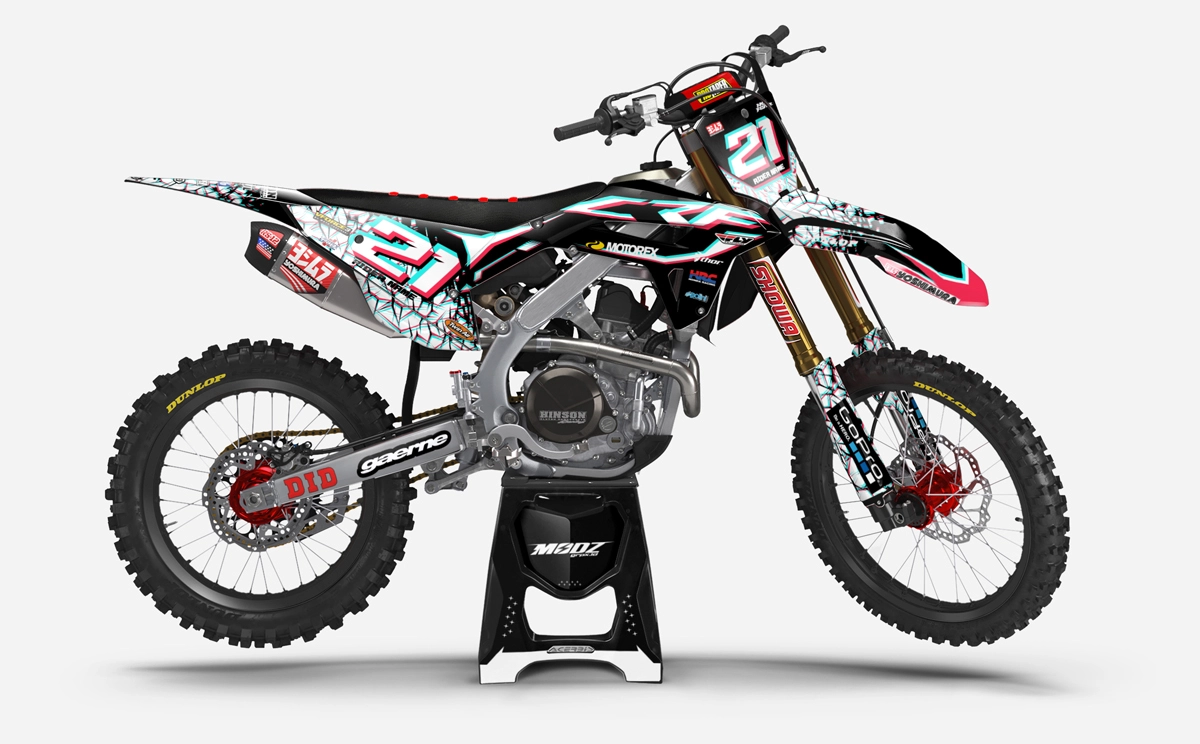 Custom motocros graphic kits for HONDA, designed for any dirt bike model and year. Our graphics kits are made using Substance materials, the industry’s leading print media for motocross and other power-sport applications. Developed alongside the world’s best racers and tested in harsh conditions, these graphics are built to withstand the rigors of off-road riding. With FLO Technology, installation is a breeze as it eliminates bubbles and massively reduces installation time, allowing you to spend more time on the track or trails. Stand out from the crowd and protect your bike with these high-quality, custom MX graphics.