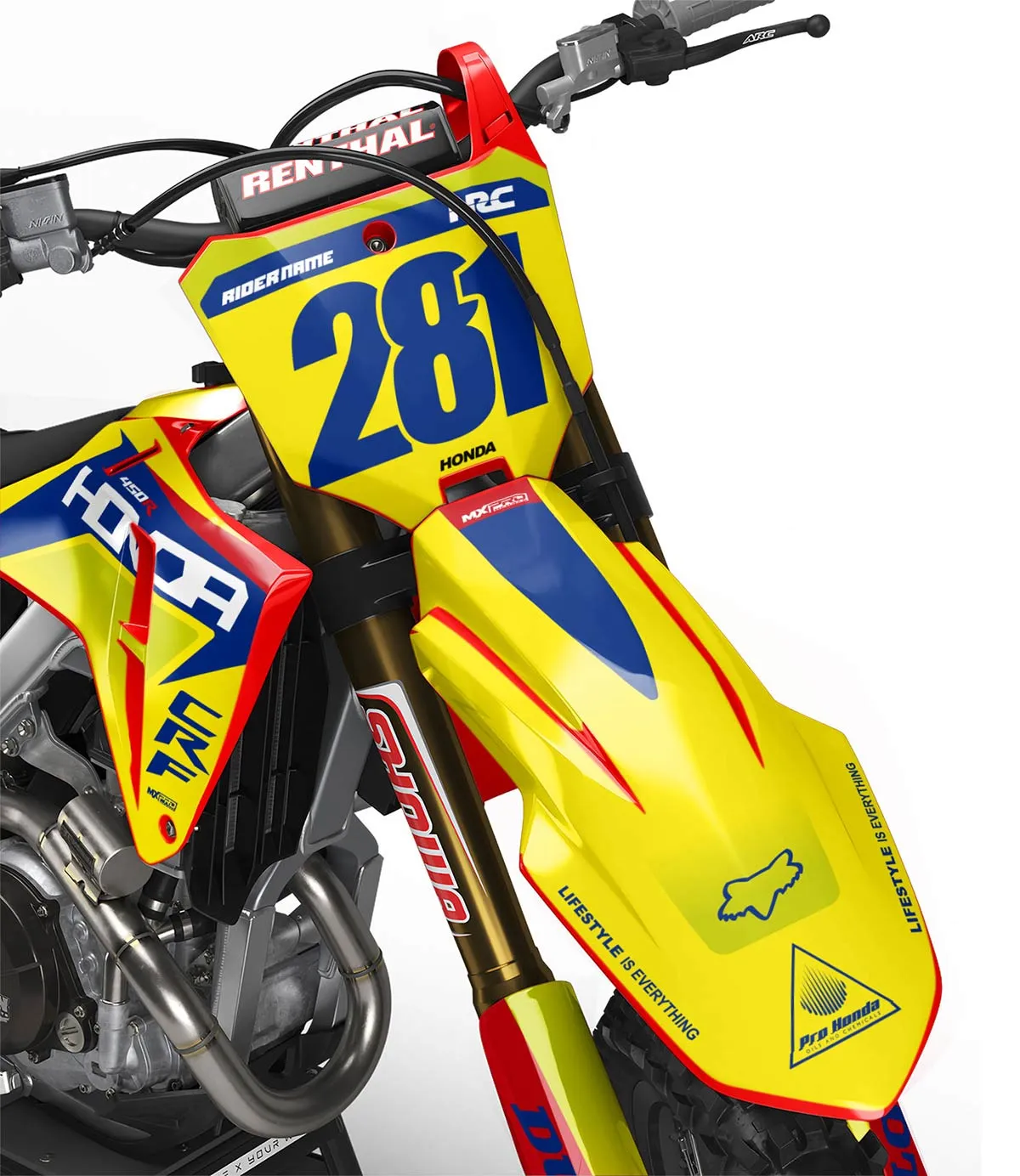 Custom motocros graphic kits for Honda, designed for any dirt bike model and year. Our graphics kits are made using Substance materials, the industry’s leading print media for motocross and other power-sport applications. Developed alongside the world’s best racers and tested in harsh conditions, these graphics are built to withstand the rigors of off-road riding. With FLO Technology, installation is a breeze as it eliminates bubbles and massively reduces installation time, allowing you to spend more time on the track or trails. Stand out from the crowd and protect your bike with these high-quality, custom MX graphics.