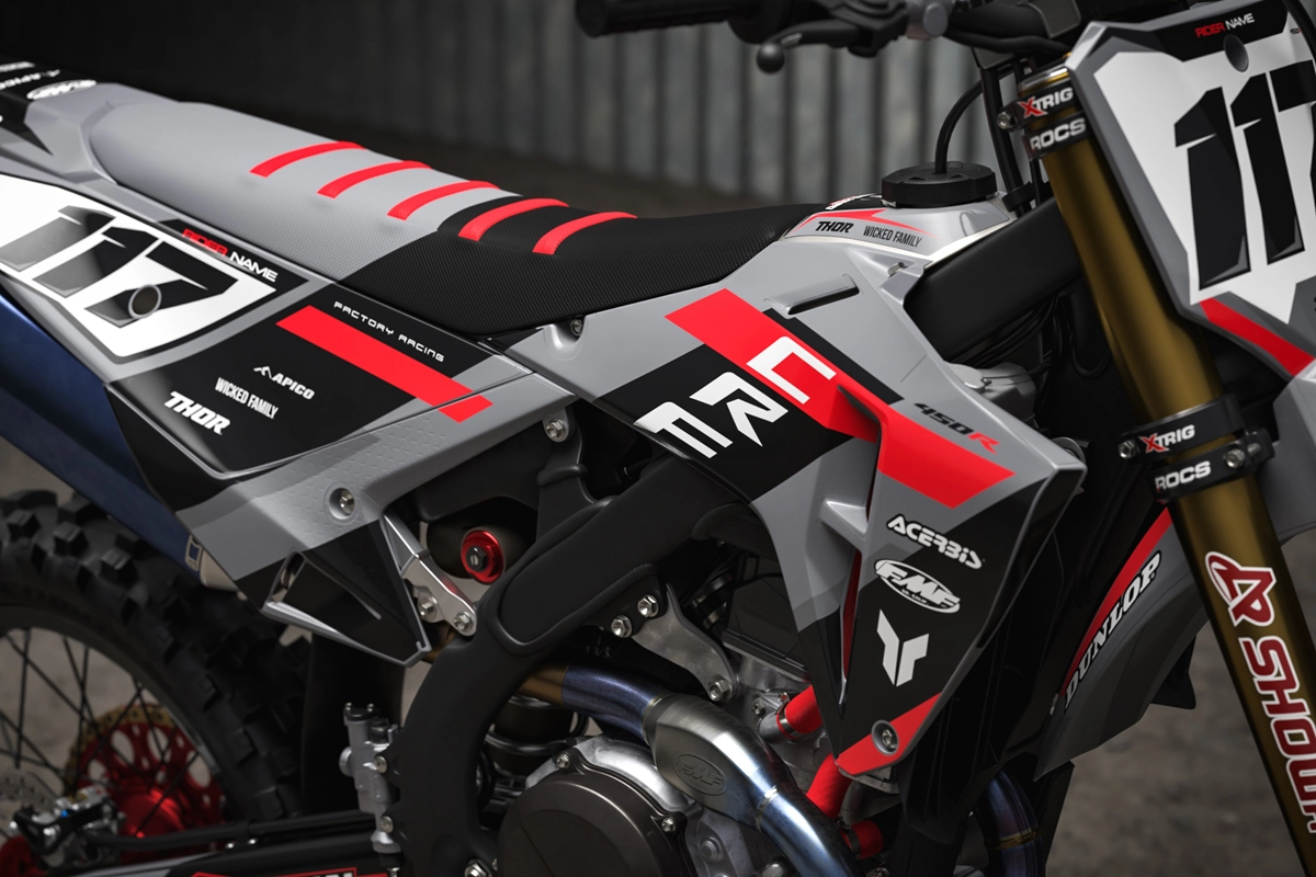 Custom motocros graphic kits for HONDA, designed for any dirt bike model and year. Our graphics kits are made using Substance materials, the industry’s leading print media for motocross and other power-sport applications. Developed alongside the world’s best racers and tested in harsh conditions, these graphics are built to withstand the rigors of off-road riding. With FLO Technology, installation is a breeze as it eliminates bubbles and massively reduces installation time, allowing you to spend more time on the track or trails. Stand out from the crowd and protect your bike with these high-quality, custom MX graphics.
