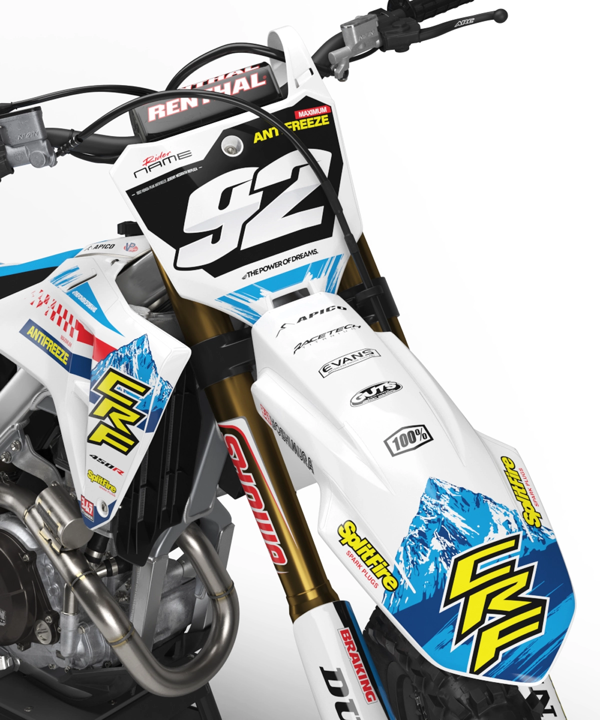 Custom motocros graphic kits for HONDA, designed for any dirt bike model and year. Our graphics kits are made using Substance materials, the industry’s leading print media for motocross and other power-sport applications. Developed alongside the world’s best racers and tested in harsh conditions, these graphics are built to withstand the rigors of off-road riding. With FLO Technology, installation is a breeze as it eliminates bubbles and massively reduces installation time, allowing you to spend more time on the track or trails. Stand out from the crowd and protect your bike with these high-quality, custom MX graphics.
