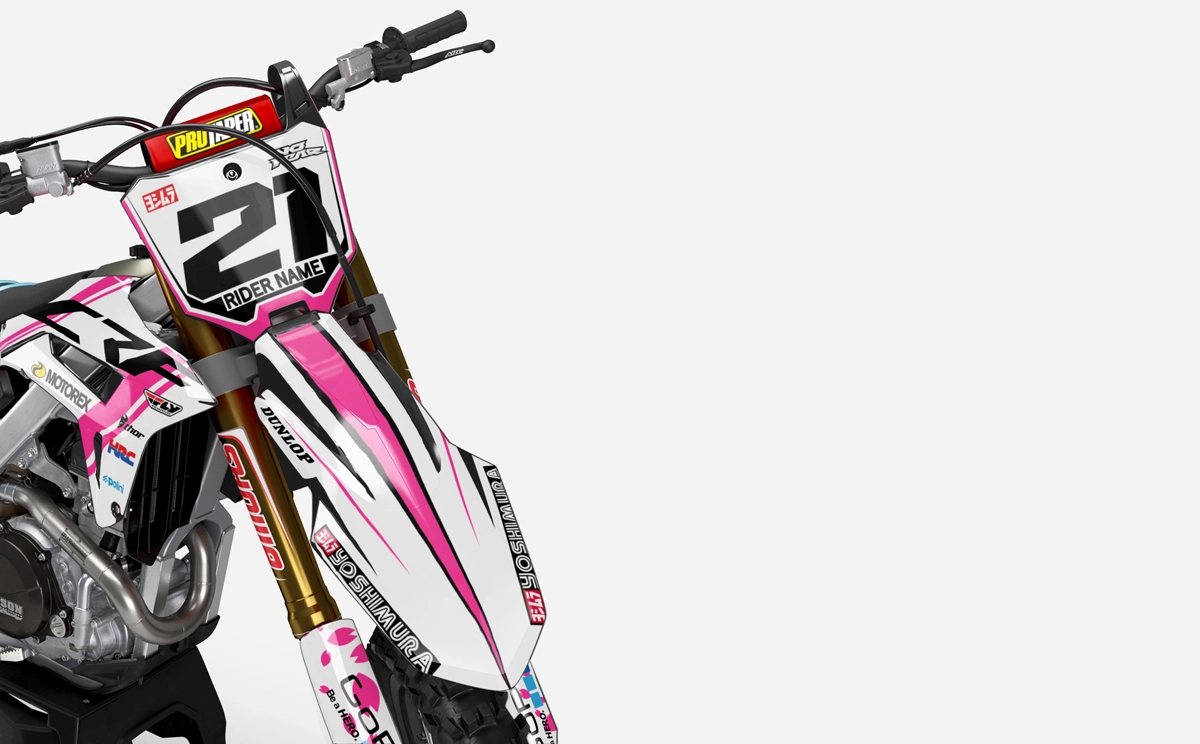 Custom motocros graphic kits for HONDA, designed for any dirt bike model and year. Our graphics kits are made using Substance materials, the industry’s leading print media for motocross and other power-sport applications. Developed alongside the world’s best racers and tested in harsh conditions, these graphics are built to withstand the rigors of off-road riding. With FLO Technology, installation is a breeze as it eliminates bubbles and massively reduces installation time, allowing you to spend more time on the track or trails. Stand out from the crowd and protect your bike with these high-quality, custom MX graphics.