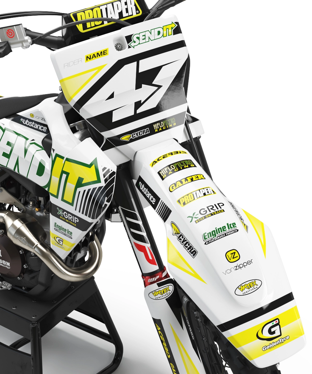 Motocross graphics kits are made using Substance materials only – industry leading print media for motocross and other power-sport applications. Developed alongside worlds best racers and tested in harsh conditions. FLO Technology eliminates bubbles and massively reduces installation time.