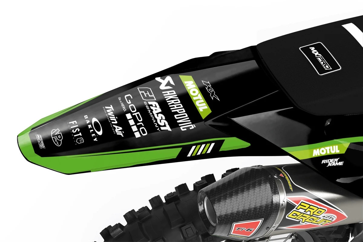 Custom motocros graphic kits for KAWASAKI, designed for any dirt bike model and year. Our graphics kits are made using Substance materials, the industry’s leading print media for motocross and other power-sport applications. Developed alongside the world’s best racers and tested in harsh conditions, these graphics are built to withstand the rigors of off-road riding. With FLO Technology, installation is a breeze as it eliminates bubbles and massively reduces installation time, allowing you to spend more time on the track or trails. Stand out from the crowd and protect your bike with these high-quality, custom MX graphics.