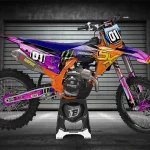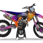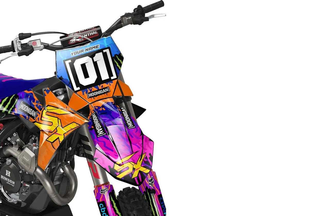 Custom motocros graphic kits for KTM, designed for any dirt bike model and year. Our graphics kits are made using Substance materials, the industry’s leading print media for motocross and other power-sport applications. Developed alongside the world’s best racers and tested in harsh conditions, these graphics are built to withstand the rigors of off-road riding. With FLO Technology, installation is a breeze as it eliminates bubbles and massively reduces installation time, allowing you to spend more time on the track or trails. Stand out from the crowd and protect your bike with these high-quality, custom MX graphics.