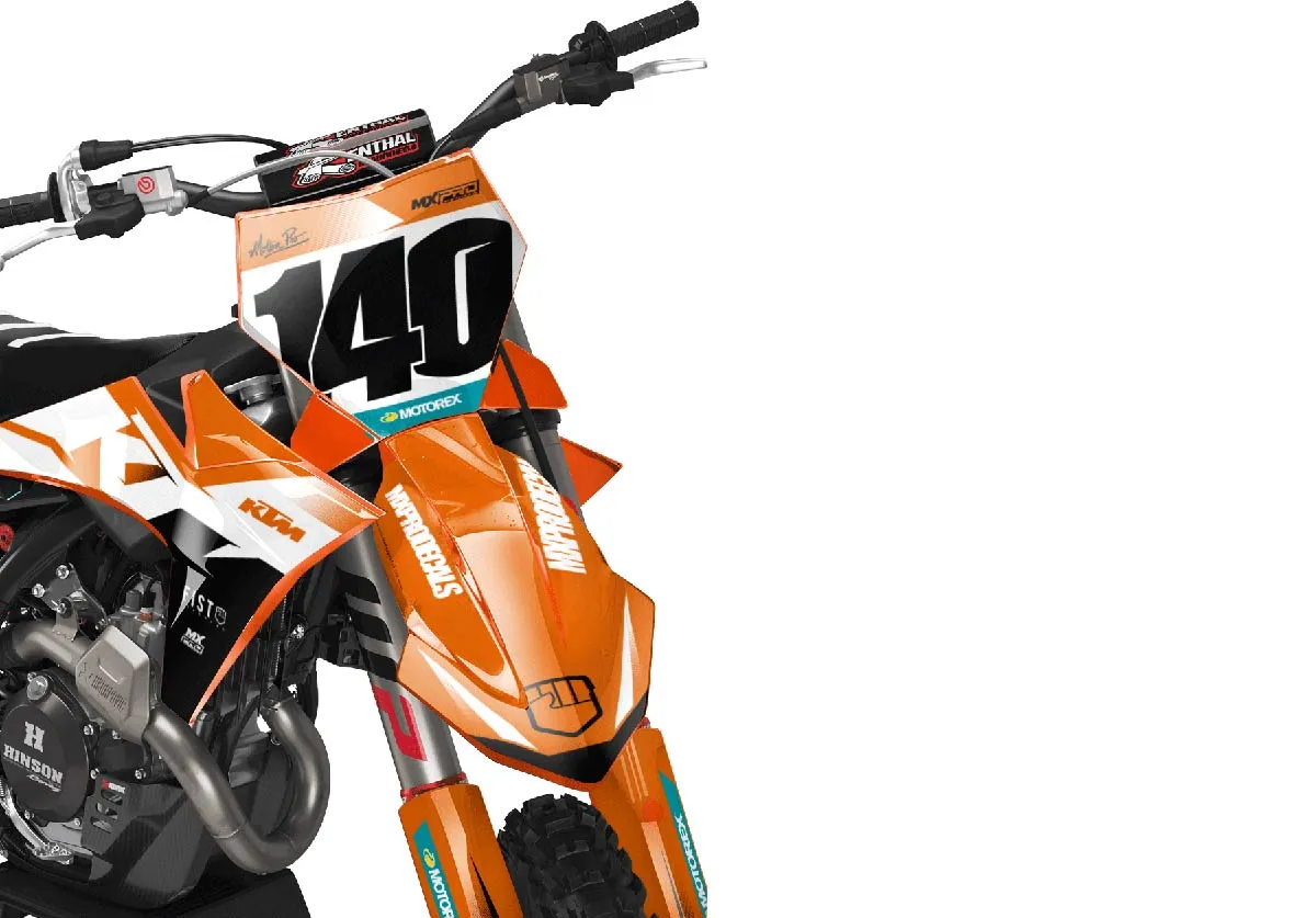 Custom motocros graphic kits for KTM, designed for any dirt bike model and year. Our graphics kits are made using Substance materials, the industry’s leading print media for motocross and other power-sport applications. Developed alongside the world’s best racers and tested in harsh conditions, these graphics are built to withstand the rigors of off-road riding. With FLO Technology, installation is a breeze as it eliminates bubbles and massively reduces installation time, allowing you to spend more time on the track or trails. Stand out from the crowd and protect your bike with these high-quality, custom MX graphics.