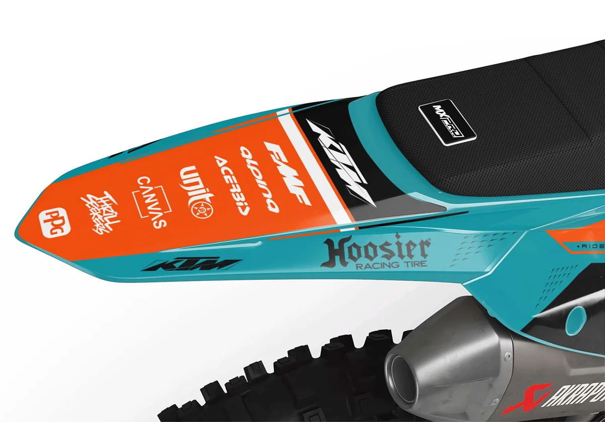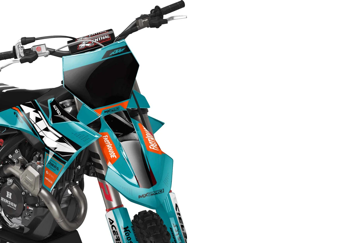 Custom motocros graphic kits for KTM, designed for any dirt bike model and year. Our graphics kits are made using Substance materials, the industry’s leading print media for motocross and other power-sport applications. Developed alongside the world’s best racers and tested in harsh conditions, these graphics are built to withstand the rigors of off-road riding. With FLO Technology, installation is a breeze as it eliminates bubbles and massively reduces installation time, allowing you to spend more time on the track or trails. Stand out from the crowd and protect your bike with these high-quality, custom MX graphics.