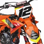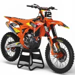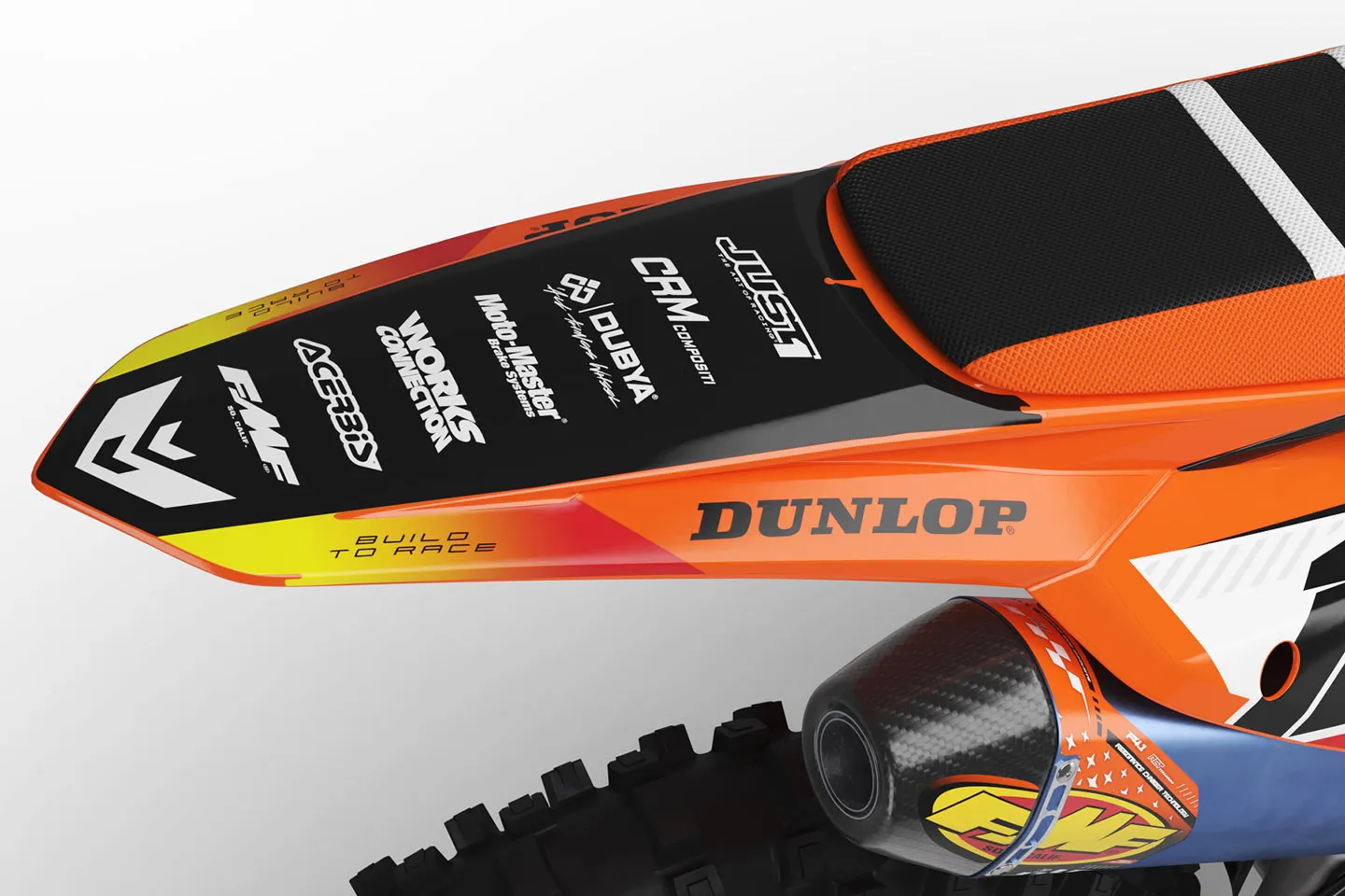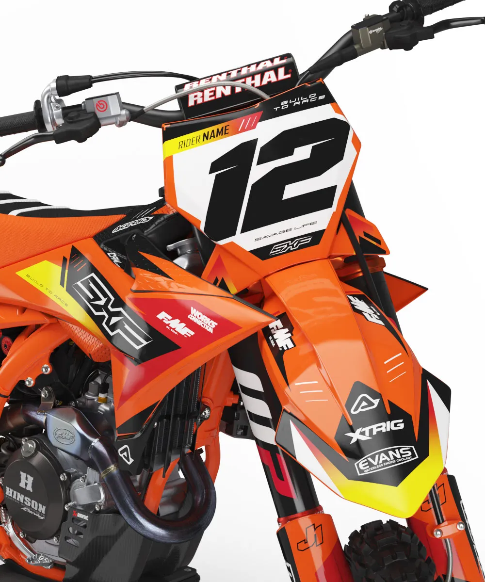 Custom motocros graphic kits for KTM, designed for any dirt bike model and year. Our graphics kits are made using Substance materials, the industry’s leading print media for motocross and other power-sport applications. Developed alongside the world’s best racers and tested in harsh conditions, these graphics are built to withstand the rigors of off-road riding. With FLO Technology, installation is a breeze as it eliminates bubbles and massively reduces installation time, allowing you to spend more time on the track or trails. Stand out from the crowd and protect your bike with these high-quality, custom MX graphics.