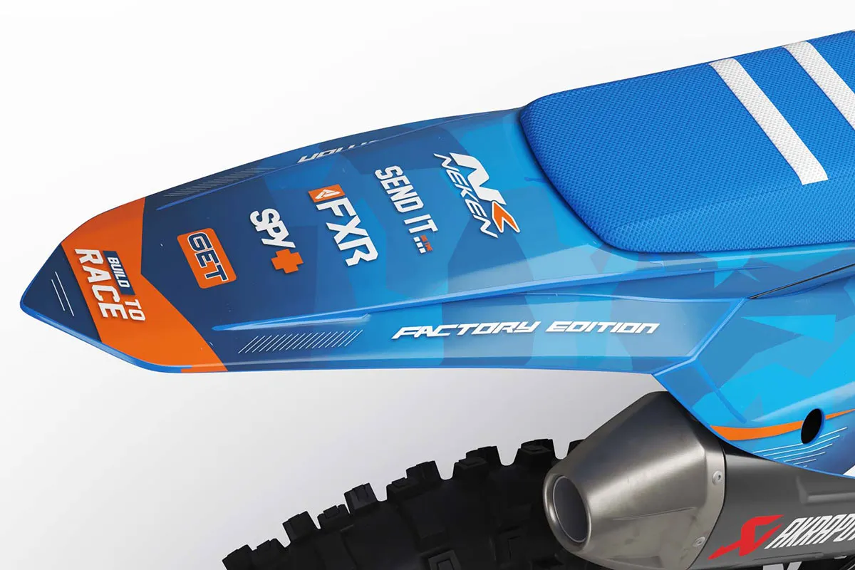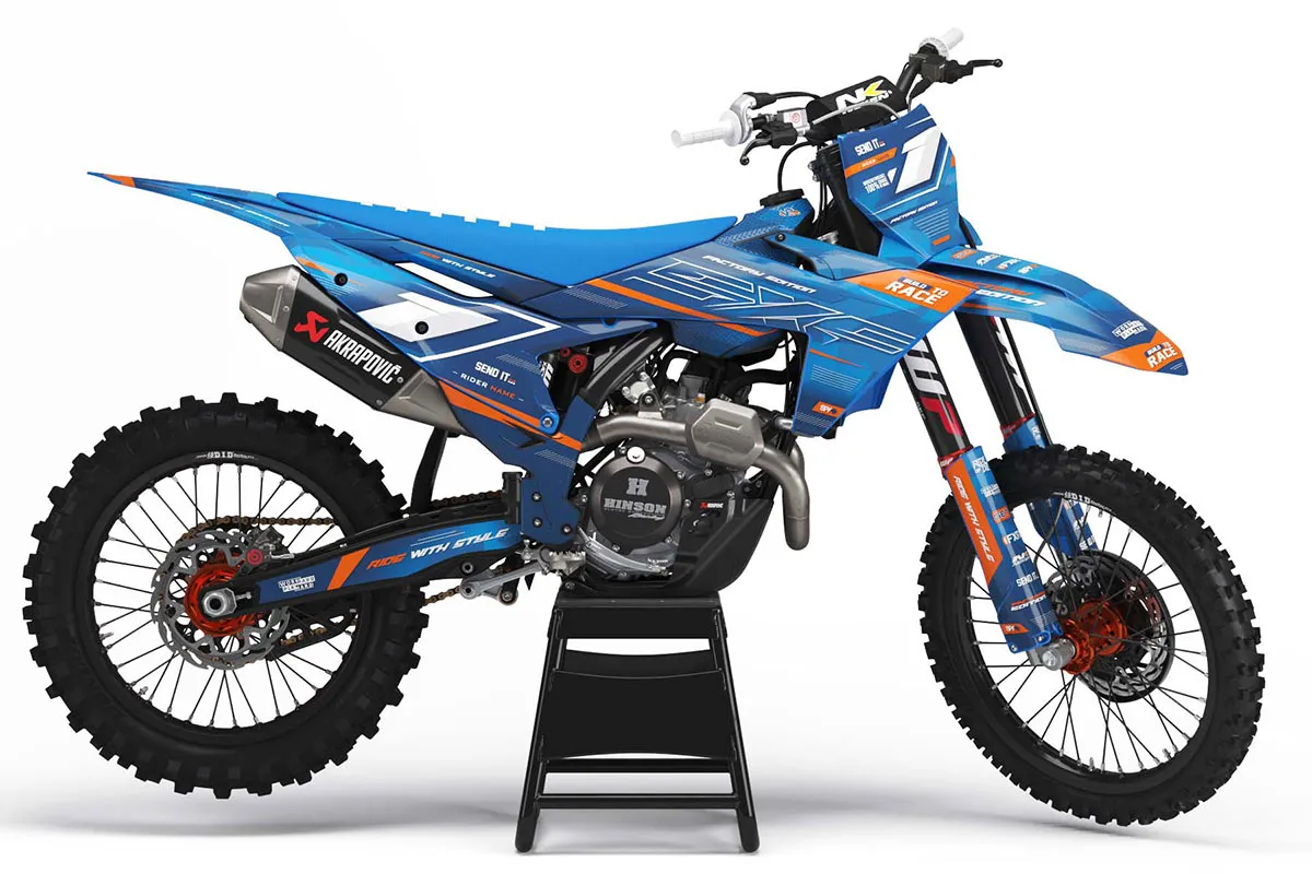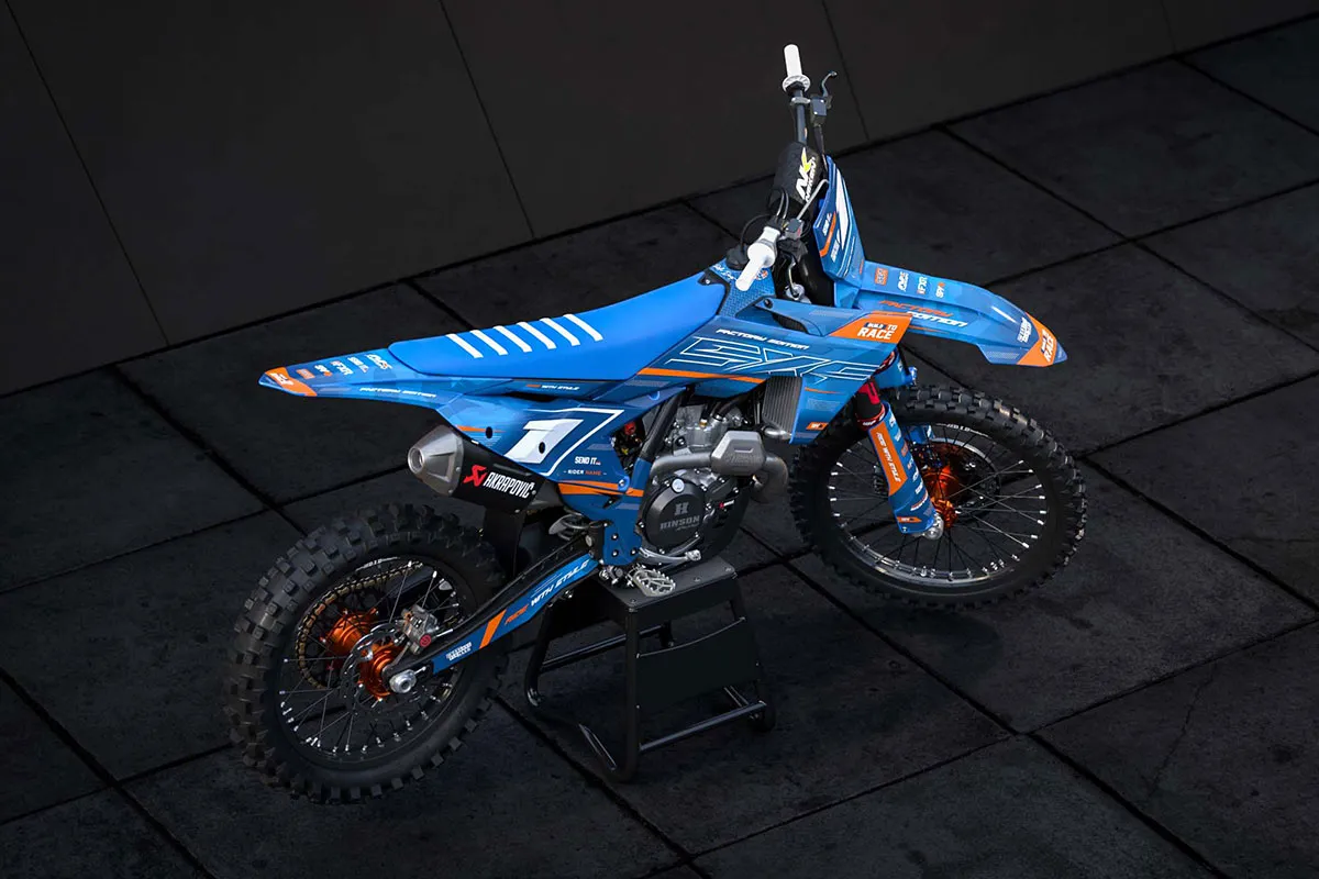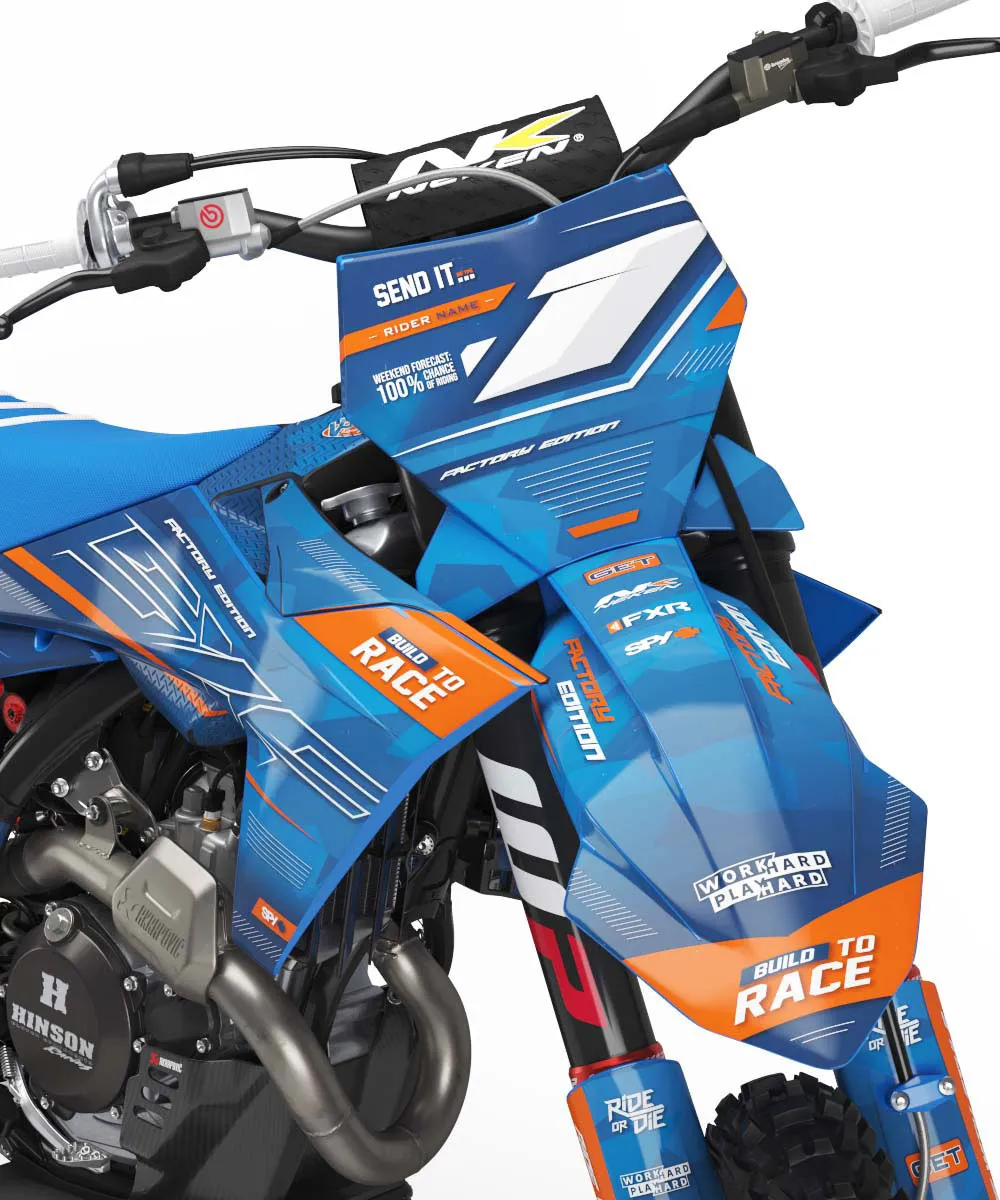 Custom motocros graphic kits for KTM, designed for any dirt bike model and year. Our graphics kits are made using Substance materials, the industry’s leading print media for motocross and other power-sport applications. Developed alongside the world’s best racers and tested in harsh conditions, these graphics are built to withstand the rigors of off-road riding. With FLO Technology, installation is a breeze as it eliminates bubbles and massively reduces installation time, allowing you to spend more time on the track or trails. Stand out from the crowd and protect your bike with these high-quality, custom MX graphics.