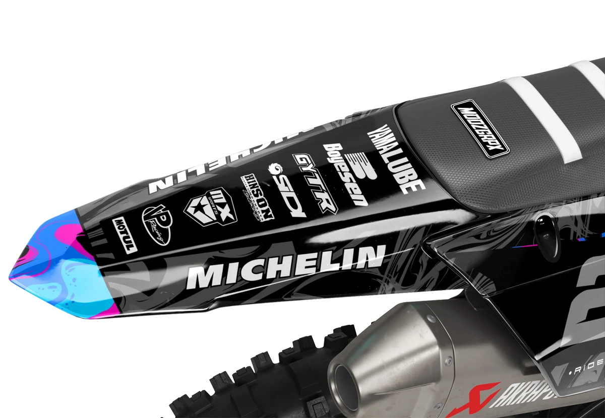 Custom motocros graphic kits for YAMAHA, designed for any dirt bike model and year. Our graphics kits are made using Substance materials, the industry’s leading print media for motocross and other power-sport applications. Developed alongside the world’s best racers and tested in harsh conditions, these graphics are built to withstand the rigors of off-road riding. With FLO Technology, installation is a breeze as it eliminates bubbles and massively reduces installation time, allowing you to spend more time on the track or trails. Stand out from the crowd and protect your bike with these high-quality, custom MX graphics.