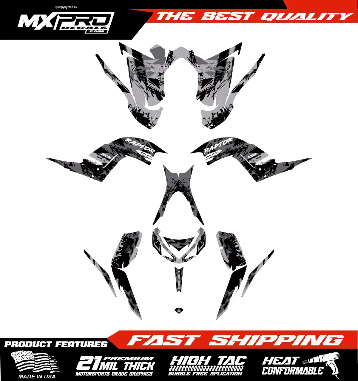 Custom ATV Yamaha Raptor 700 2003 to 2012 graphic kit. Our graphics kits are made using Substance materials, the industry’s leading print media for motocross and other power-sport applications.