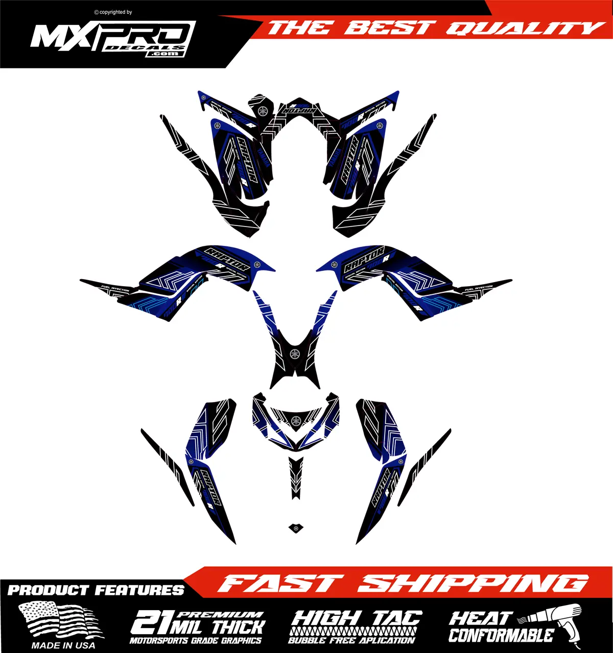 Custom ATV Yamaha Raptor 700 2003 to 2012 graphic kit. Our graphics kits are made using Substance materials, the industry’s leading print media for motocross and other power-sport applications.