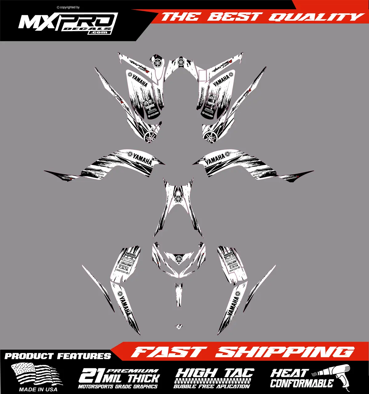 Custom ATV Yamaha Raptor 700 2003 to 2012 graphic kit. Our graphics kits are made using Substance materials, the industry’s leading print media for motocross and other power-sport applications.