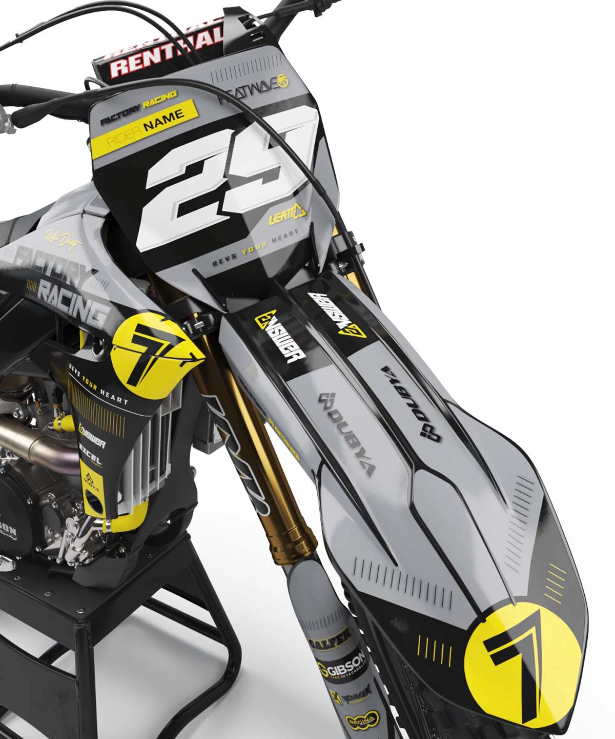 Motocross graphics kits are made using Substance materials only – industry leading print media for motocross and other power-sport applications. Developed alongside worlds best racers and tested in harsh conditions. FLO Technology eliminates bubbles and massively reduces installation time.