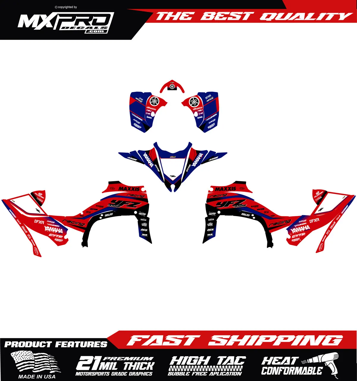 Custom ATV Yamaha Raptor 700 2014 to 2025 graphic kit. Our graphics kits are made using Substance materials, the industry’s leading print media for motocross and other power-sport applications. Developed alongside the world’s best racers and tested in harsh conditions, these graphics are built to withstand the rigors of off-road riding. With FLO Technology, installation is a breeze as it eliminates bubbles and massively reduces installation time, allowing you to spend more time on the track or trails. Stand out from the crowd and protect your bike with these high-quality, custom MX graphics.