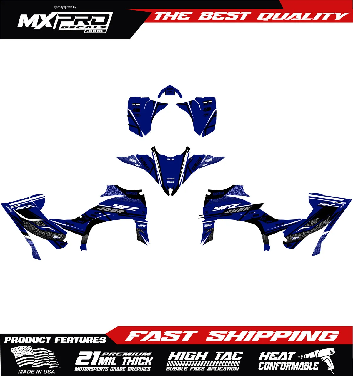 Custom ATV Yamaha Raptor 700 2003 to 2012 graphic kit. Our graphics kits are made using Substance materials, the industry’s leading print media for motocross and other power-sport applications.